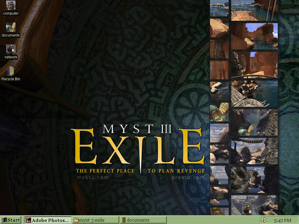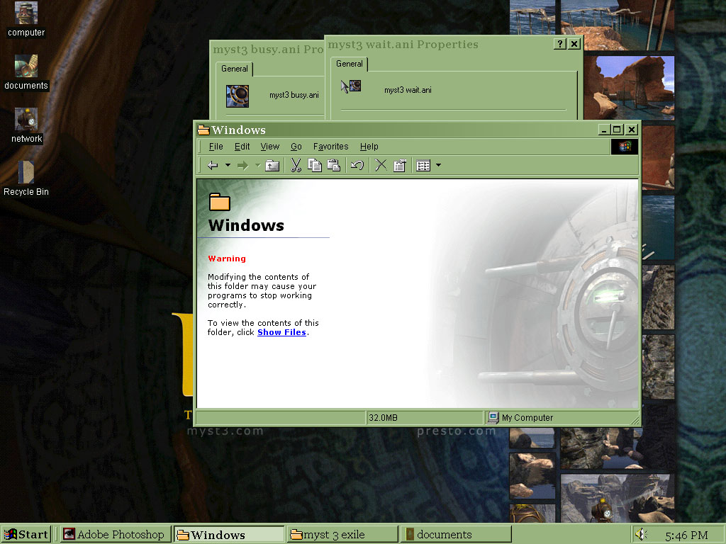 I designed and created both of these themes as a contractor for Presto Studios. Both themes include custom wallpapers, icons, cursors, startup and shutdown screens, web views, and sounds. The themes can be found at download.com, and the Myst 3 website.